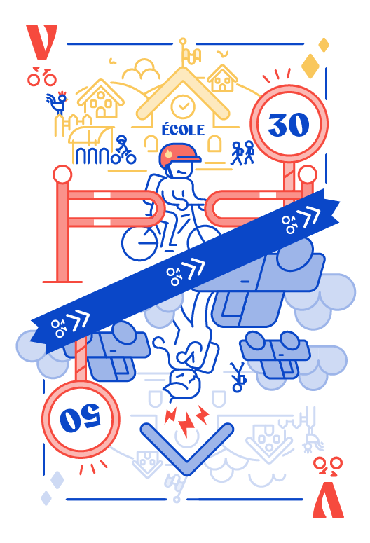 Repenser le plan de circulation pour favoriser les trajets à vélo : utiliser les routes secondaires, voies résidentielles et chemins existants pour créer des itinéraires continus, sûrs et agréables. Réduire le transit motorisé, généraliser le 30km/h et faire du 50 km/h l’exception.